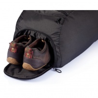 600D ribstop, zippered front pocket with organizers inside, side pocket, shoe pocket, webbing handles and shoulder strap, 4 stand feet on base, PVC free.