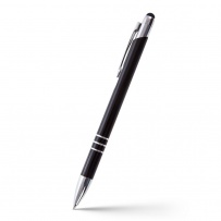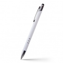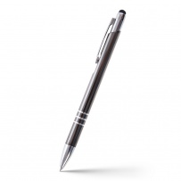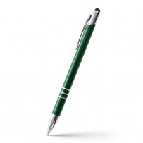 Ball pen, coloured barrel with shiny finish, details in silver colour, stylus tip enables touch screen operation, writes in blue, product made from aluminium