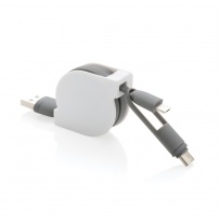 Compact and retractable 3 in 1 charging cable with type C and double-sided connector for IOS and Android devices that require micro usb. Because of the retractable mechanism the 100 cm long flat cable can easily be taken anywhere without it getting tangled. ABS case with TPU material cable. Also suitable for syncing.