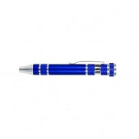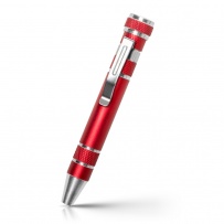 Śrubokręt w kształcie długopisu z 4 płaskimi i 4 krzyżakowymi końcówkami, posiada klip umożliwiający przypinanie, produkt wykonany z aluminium i stali