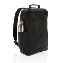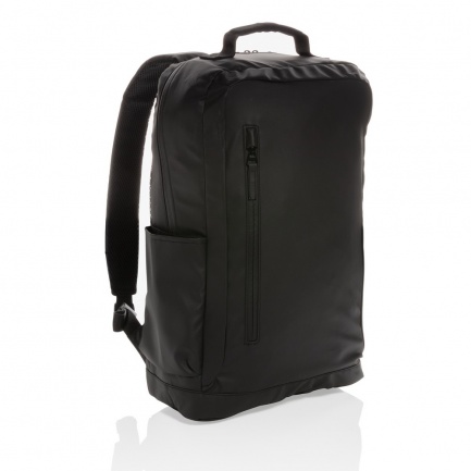 Look effortlessly stylish when carrying this reversed all black laptop backpack. This bag holds a roomy compartment for all your gear and a laptop compartment that can hold a 15.6"laptop. PVC free.