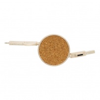 Zwijany kabel do ładowania, końcówki: USB, 2 x USB C, 2 w 1 (micro USB oraz kompatybilna z urządzeniami iOS), obudowa wykonana z mieszanki 35% korka i słomy pszenicznej oraz ABS, kable z TPE niezawierającego PVC, długość do 100 cm, ślad węglowy produktu: 0,23 kg CO2