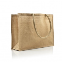 Shopping bag with laminated interior which reduces the risk of material tearing, features long handles for carrying the bag on the shoulder, product made from laminated jute 340 g/m2