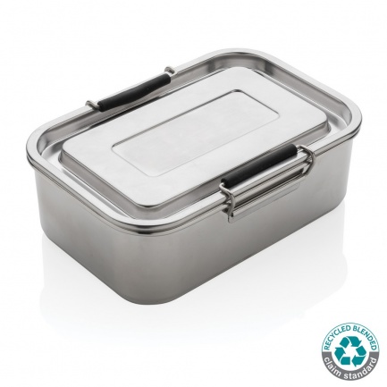 Pudełko śniadaniowe 800 ml, lunchbox, zamykane na 2 zatrzaski, solidne i szczelne, wykonane w 95% ze stali nierdzewnej z recyklingu, wykorzystane materiały posiadają certyfikat GRS (Global Recycled Standard) który gwarantuje, że wykorzystane materiały pochodzą z recyklingu, zawartość materiału z recyklingu jest obliczana w oparciu o wagę całkowitą przedmiotu, wyłącznie do zimnych potraw, nie należy używać w kuchence mikrofalowej i myć w zmywarce, w opakowaniu z papieru kraftowego, ślad węglowy produktu: 1,33 kg CO2