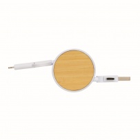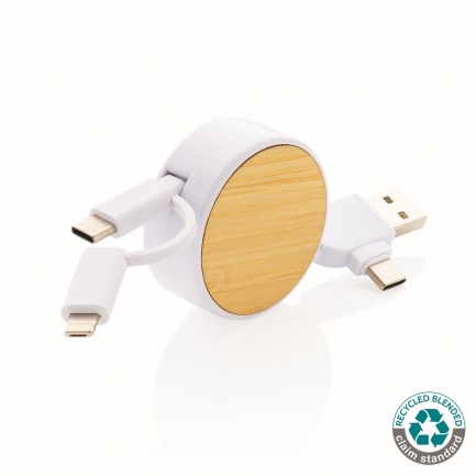 Kabel do ładowania, końcówki: USB, 2 x USB C, micro USB, iOS, obudowa wykonana z bambusa i ABS z recyklingu, kabel wykonany z TPE z recyklingu, kabel i obudowa posiadają certyfikaty RCS, długość 100 cm, nie zawiera PVC