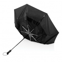 Parasol 27" sztormowy, kieszonkowy rozmiar, po rozłożeniu jest odpowiedni dla 2 osób, automatyczne otwieranie i zamykanie, składany na 3 części, aluminiowa rama, żebrowanie z włókna szklanego, panele 190T RPET wykonane z 11,7 poddanych recyklingowi butelek PET (500 ml), dzięki czemu zaoszczędzonych zostało 7 l wody, dzięki zastosowaniu technologii fizycznych znaczników AWARE? wykorzystane materiały są identyfikowalne z pochodzenia, 2% wpływów z każdego sprzedanego produktu z kolekcji Impact jest przekazywane na rzecz Water.org, ślad węglowy produktu: 3,57 kg CO2