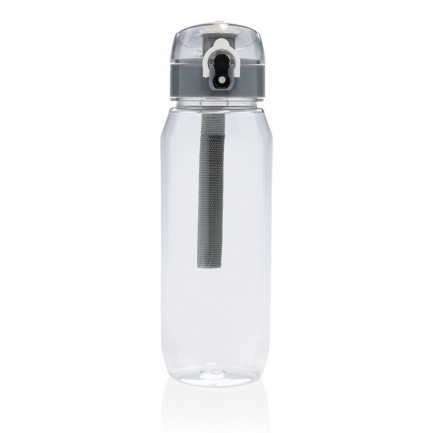 Butelka sportowa 800 ml, uchwyt, wykonana z RPET, nie wymaga obsługi oburącz, całkowita zawartość materiałów z recyklingu obliczona na podstawie wagi całkowitej przedmiotu: 73%, wyłącznie mycie ręczne, zalecana wyłącznie do zimnej wody, w pudełku z papieru kraftowego