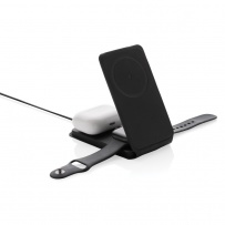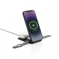 Ładowarka bezprzewodowa 3 w 1, ładowarka bezprzewodowa 15W do telefonu, ładowarka bezprzewodowa 5W do słuchawek, ładowarka bezprzewodowa 2,5W do ładowania smartwatchy (kompatybilne wyłączenie z urządzeniami iOS), wykonana z PU z recyklingu z certyfikatem RCS, całkowita zawartość materiałów z recyklingu obliczona na podstawie wagi całkowitej przedmiotu: 5%, bezprzewodowe ładowanie jest kompatybilne ze wszystkimi urządzeniami posiadającymi możliwość ładowania indukcyjnego, wejście 9V/3A, kabel 120 cm z TPE z recyklingu z certyfikatem RCS w komplecie, w pudełku z papieru kraftowego