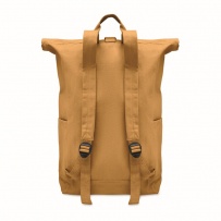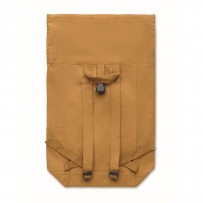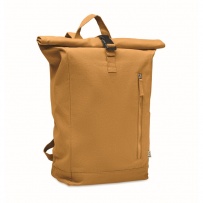 Roll top backpack with hook and loop closure in 390 gr/m2 recycled cotton (80%) and recycled polyester (20%). Zippered front pocket.