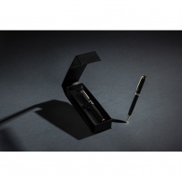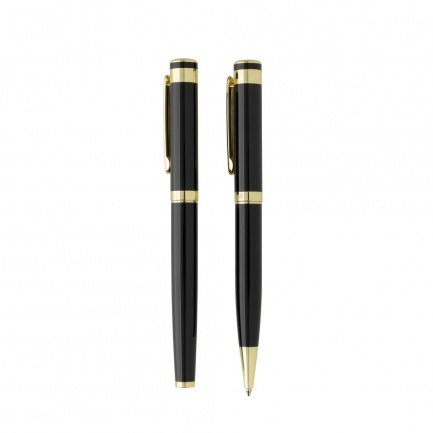 Ekskluzywny zestaw piśmienny, pióro żelowe oraz długopis z logotypem Swiss Peak wykonane z mosiądzu z recyklingu z certyfikatem RCS, akcenty w kolorze złotym, niebieski wkład, długość pisania długopisu ok. 1200 m, długość pisania pióra ok. 800 m, pudełko podarunkowe w komplecie, całkowita zawartość materiałów z recyklingu obliczona w oparciu o wagę całkowitą przedmiotu: 55%