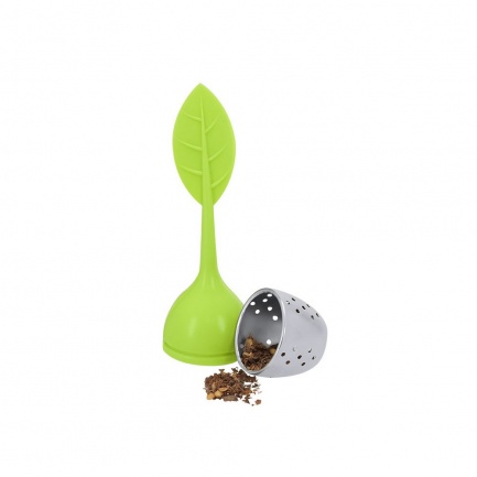 Tea infuser with leaf design, made of silicone and stainless steel. Includes a silicone base.