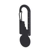 Multitool made of stainless steel with a matte black finish. Designed to meet multiple needs, it includes 8 functions: nut wrench in various sizes, ruler for measurements, bottle opener, shopping cart coin, etc. With a carabiner closure.