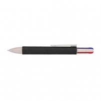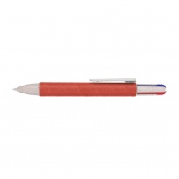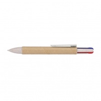 Stylo quatre couleurs, écrit en couleurs : bleu, noir, rouge et vert, longueur d'écriture 300 m?tres pour chaque couleur, clip pour accrocher facilement ? une poche ou ? la couverture d'un cahier, produit fabriqué ? partir de carton recyclé et de paille de blé.