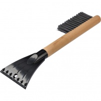 Ice scraper with snow bristle, wooden handle, for more comfortable clearing snow from car, packed in a recycled polybag, product made from ABS
