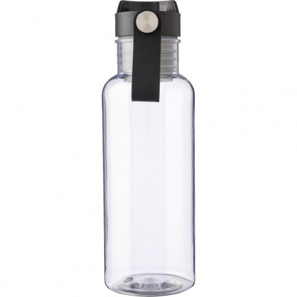 Butelka sportowa 600 ml z czarną nakrętką, dziubek otwierany i zamykany po naciśnięciu przycisku, uchwyt ułatwiający noszenie, produkt wykonany ze RPET, PP, silikonu i stali nierdzewnej