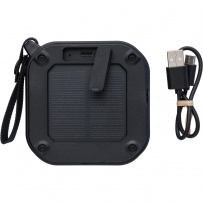 Wireless speaker, IPX6 which means protection against water jets for 3 minutes, wristband and carabiner for attaching, output power 3 W, DC 5 V input, built-in 400 mAh battery, works at a distance of 15-20 meters from the signal source, signal ratio to noise 75 dB, 100 Hz-20 K Hz frequency, includes 30 cm length type C charging cable, built-in LED flashlight (30 lumens), solar panel extending the use time, 4 hours of playing time, BT 5.3, packed in a brown carton box, product made from recycled ABS, PVC