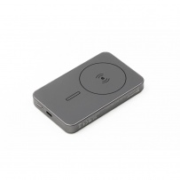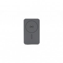 Wireless speaker BrandCharger Powerwave 5000, slim aluminium unibody design that fits easily in any pocket, 5,000 mAh capacity, supports 15W magnetic wireless charging (MagSafe, Qi1 & Qi2) for easy, cable-free charging, includes a 20W (PD 3.0) USB-C port to charge laptops or other devices, the LCD display shows battery level and charging status, while a smart chip offers protection from overcurrent, overcharging, overheating, and short-circuiting, magnetic snap for quick, secure attachment, product made from ABS and recycled aluminium