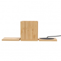 Pojemnik na przybory do pisania, podgrzewacz do kubka, ładowarka bezprzewodowa 15W, działa z urządzeniami posiadającymi możliwość ładowania indukcyjnego, wejście/wyjście USB-C 9-12V/2-1.5A, kabel USB-C w komplecie, produkt wykonany z bambusa