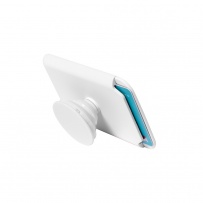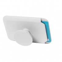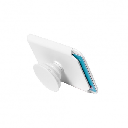 Cardholder with a folding support for smartphones. Designed to hold up to two cards, includes an adhesive metal ring for support and an adjustable and removable ring for better use, in glossy color.