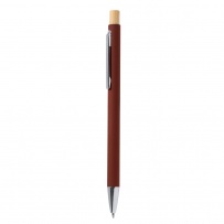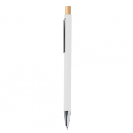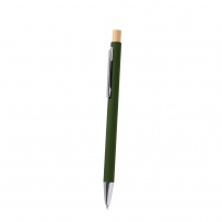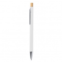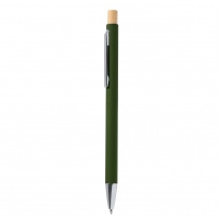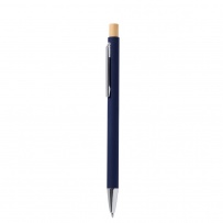 Push-button pen made from recycled aluminum. Bamboo button and body finished in matte rubber. Metal clip and recycled aluminum label on the top of the pen, in blue ink.Recycled aluminum is a material with almost infinite recycling possibilities, without losing its original properties and consuming less energy in this process.GRS (Global Recycled Standard) certification, which guarantees the recycled origin of the material used to manufacture the product.Materials like bamboo promote the use of natural raw materials, reducing polluting emissions. Additionally, bamboo comes from a very resilient and versatile plant, with rapid growth and regeneration, making it an excellent alternative to traditional wood use.Jumbo refill.