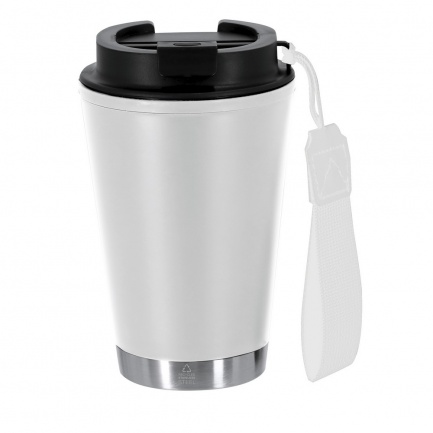 Double-walled thermal cup made of recycled PP, combined with a base made of recycled stainless steel. With a capacity of 300 ml.With a lid with an easy-opening dispenser and an anti-leak hermetic sealing system. BPA-free.Includes a practical transport strap, ideal for easy carrying in any situation. Food Grade certified, guaranteeing safety when food comes into contact with the material used to manufacture the product. Includes a Recycled Stainless Steel designation.Recycled PP is highly recyclable and strong plastic, suitable for many applications.Steel is one of the most demanded materials and can be found almost everywhere, from daily use products to large constructions. With countless properties, including durability and a high degree of reusability, making it a highly valued alternative in sustainability solutions. When properly treated, it allows for obtaining new resources of infinite use.