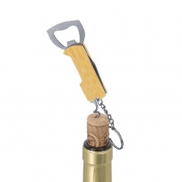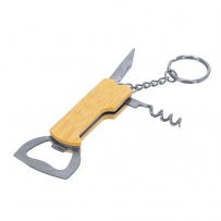 Keychain bottle opener made of bamboo and stainless steel, with a bottle opener and corkscrew, includes a knife and metal ring for keys.Materials like bamboo promote the use of natural raw materials, reducing polluting emissions. Additionally, bamboo comes from a plant of great strength and versatility, with rapid growth and regeneration, making it an excellent alternative to traditional wood.