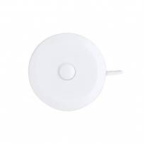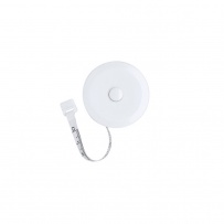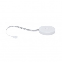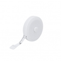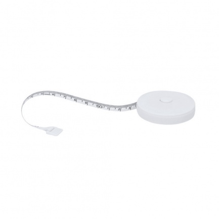 PVC tape measure 150 cm long with a retractable mechanism and stop button. Scale printed in black in cm and inches.
