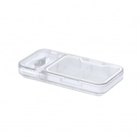 Pill organizer with 4 inner compartments, safety closure with silicone edges, and cutter for splitting pills. Made with a transparent finish.
