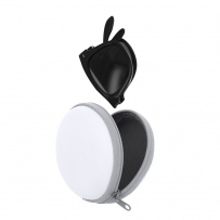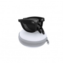 Folding sunglasses with UV400 protection, made of Recycled PC. Resistant folding frame with elegant design and shiny black finish. The lenses are black to ensure style. Presented in a round white case with zipper closure.