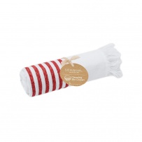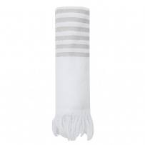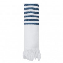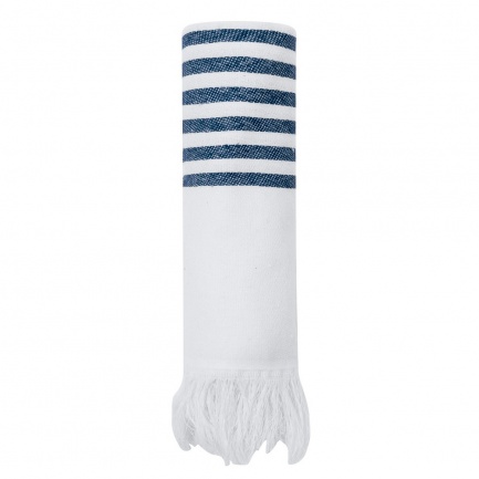 Soft pareo-towel of 300 g/m?, made from a combination of recycled cotton and recycled polyester SEAQUAL. Its design features a white base combined with colored stripes and distinguished fringes at the ends. Includes SEAQUAL design label, certifying its sustainable origin and contribution to ocean cleaning. The SEAQUAL INITIATIVE works with collaborators and authorities to help clean our oceans. Marine waste from our beaches, ocean floors, and surfaces, rivers, and estuaries is collected through cleaning programs. It is then sorted into different types of materials, and the plastic portion is cleaned and transformed into RECYCLED MARINE PLASTIC, a fully traceable raw material that creates sustainable and inspiring products. By choosing products that contain RECYCLED MARINE PLASTIC, you are helping to clean our oceans. TOGETHER FOR A CLEAN OCEAN.