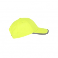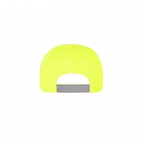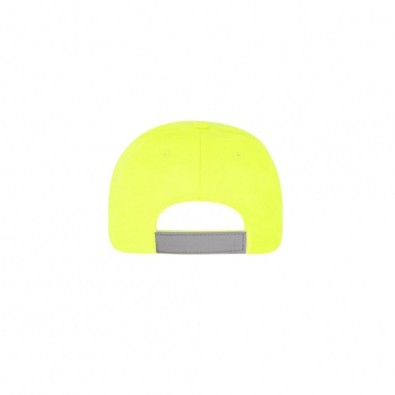 Children's sports cap made from soft polyester in a two-tone design with fluorescent yellow and reflective profile on the visor and closure. Velcro closure and embroidered ventilation holes.