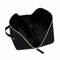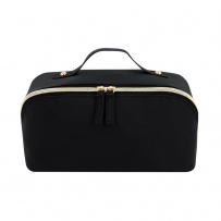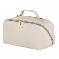 Soft PU toiletry bag, with a wide opening main compartment. With matching PU zipper pulls and golden zipper. Interior with double compartment and additional zippered pocket.