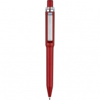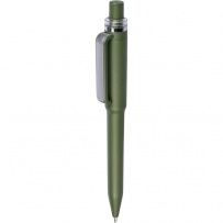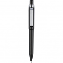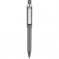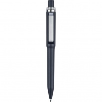 RABS ball pen designed in the shape of a travel mug, with a metallic finish. Writes in blue, an 800-meter writing length, a push mechanism, a plastic pusher, a clip, a chromed plastic ring at the top, includes recycled ABS icon on a product