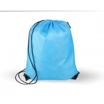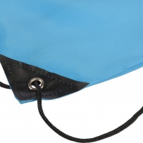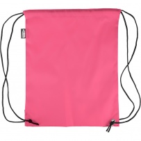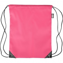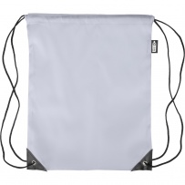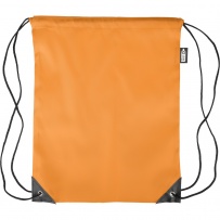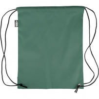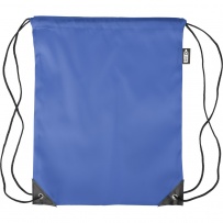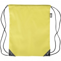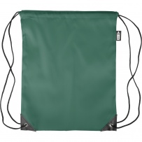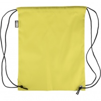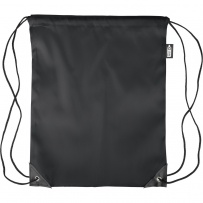 Drawstring bag, features a black nylon cord on each side, a pull-cord closure, one inner compartment, capacity: 5L, carrying capacity: 7 kg, includes RPET icon on tag, product made from RPET polyester 210D, two black PU corners on the front and internal sewing