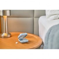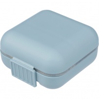Pojemnik na tabletki z 5 oddzielnymi przegródkami, każda z osobną pokrywką, posiada zamknięcie na zatrzask dla bezpiecznego przechowywania, produkt wykonany z plastiku