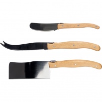 Charcuterie set in a hook and loop closed pouch, including three stainless steel knives with wooden handles, includes RPET icon on a tag inside, food-safe, individually packaged in a brown cardboard box, product made from RPET