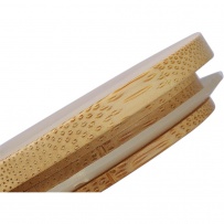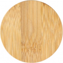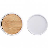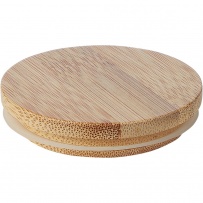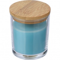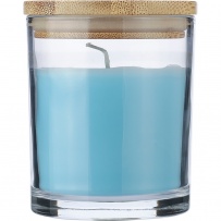 Scented candle with 120 grams of coloured wax and a vanilla scent, housed in a transparent glass container with a bamboo lid, provides approximately 20 hours of burning time, individually packaged in a white carton tube