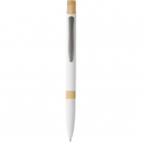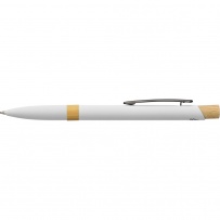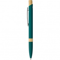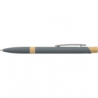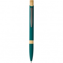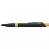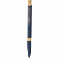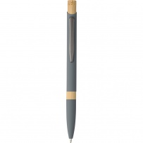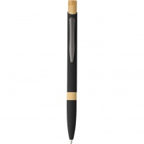 Recycled aluminium ball pen with a rubberized finish, bamboo pusher, bamboo ring in the body, features a push mechanism, 1.0 mm nib size, writes in blue with an approximate writing length of 800 meters, includes recycled aluminium icon on product