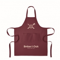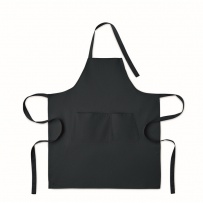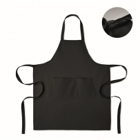 Verstellbare Küchenschürze mit 1 großen Fronttasche mit 2 Fächern. 240 g/m2 Organic Cotton. Per Knopf verstellbares Nackenband.