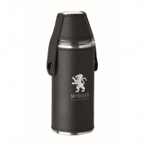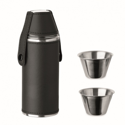 Butelka ze stali nierdzewnej z powierzchnią ze skóry PU i 2 kubkami ze stali nierdzewnej o pojemności 20 ml w pokrywie. Pojemność: 230 ml.