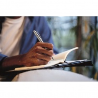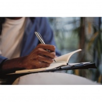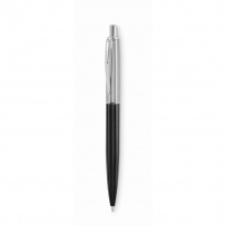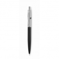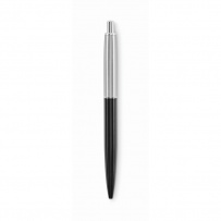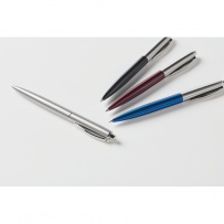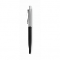 Stylo ? bille ? bouton poussoir dans un corps en acier inoxydable recyclé. Encre bleue. Présenté dans une boîte noire.