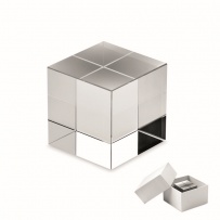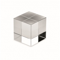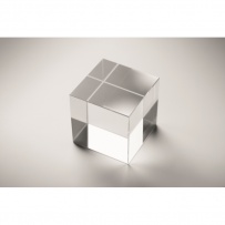 Szklana statuetka w kształcie sześcianu. Prezentowana w pudełku upominkowym.