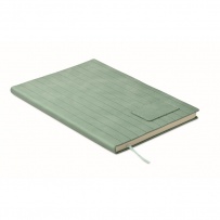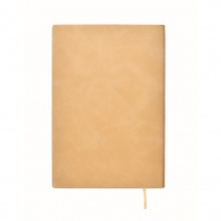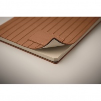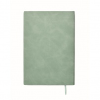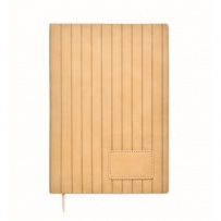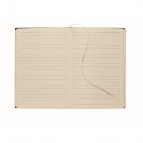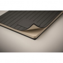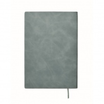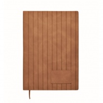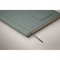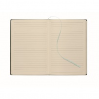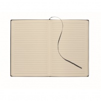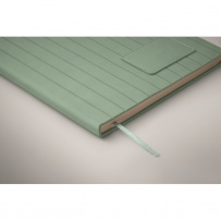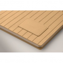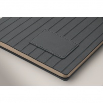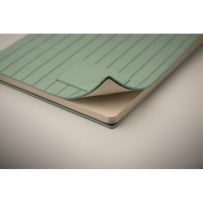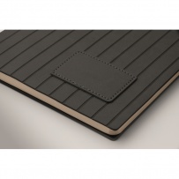 Carnet A5 avec couverture souple nervurée en PU effet patiné en 40% recyclé post-consommation et 60% PU avec patch en PU uni. 160 pages lignées, papier recyclé 70gsm (80 feuilles). Marque-page en ruban polyester de couleur assortie.