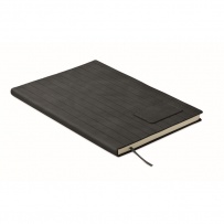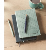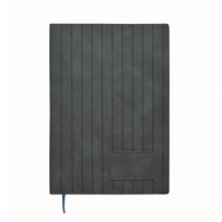 Notatnik A5 z miękką, prążkowaną okładką z PU wykonaną w 40% z materiałów pochodzących z recyklingu i w 60% z PU, z gładką naszywką z PU. 160 stron w linie, papier z recyklingu o gramaturze 70 g/m2 (80 arkuszy). Dopasowany kolorystycznie znacznik strony z tasiemki.