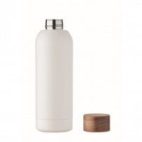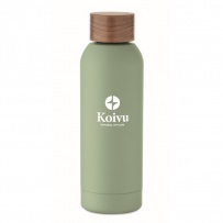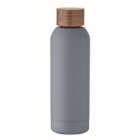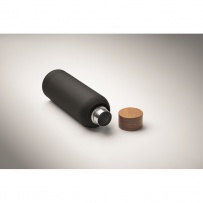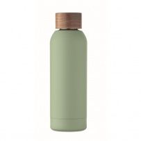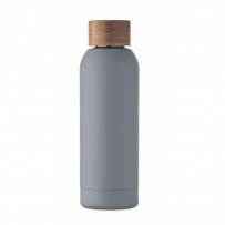 Single wall bottle recycled stainless steel (90% recycled stainless steel and 10% stainless steel) with rubber finish and acacia wooden lid finish. Leak-free. Capacity: 700 ml. As this is a single walled bottle heat transfer can still occur.