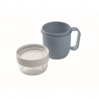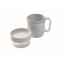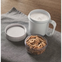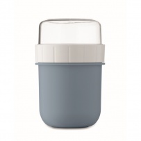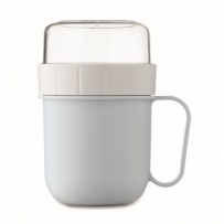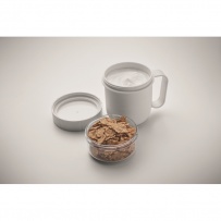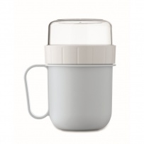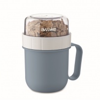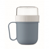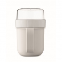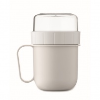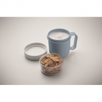 Kubek na śniadanie lub brunch w pojemniku z pokrywką PP i PS. Składa się z 2 oddzielnych pojemników do przechowywania składników oddzielnie. Pojemność: 450 ml i 160 ml. Nie przecieka.