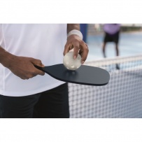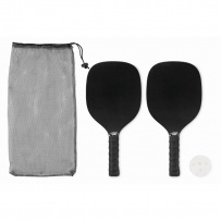 Set de pickleball avec 2 raquettes en bois et 1 balle dans une pochette en filet RPET avec cordon de serrage.