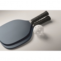 Pickleball-Set mit 2 Schlägern aus MDF-Holz und einem Ball. Lieferung in RPET-Netzbeutel mit Kordelzug.