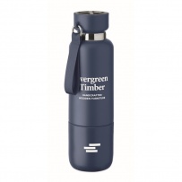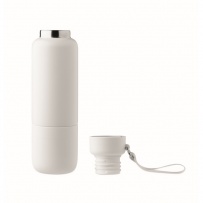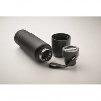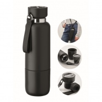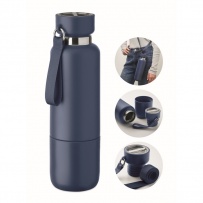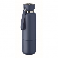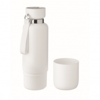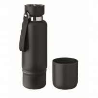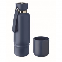 Bouteille isotherme ? double paroi en acier inoxydable recyclé (90 %) et en acier inoxydable (10 %), avec poignée intégrée et longue sangle supplémentaire (70 cm) dans le couvercle en PP. Anti fuite. Gobelet inclus. Capacité 500 ml.