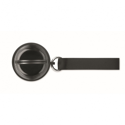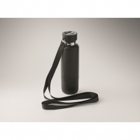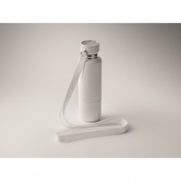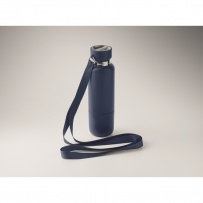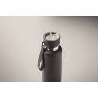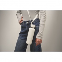 Double wall insulated bottle in 90% recycled stainless steel and 10% stainless steel, with integrated strap handle and additional long strap (70cm) in PP lid. Leak-free. Bottom cup included. Capacity: 500 ml.